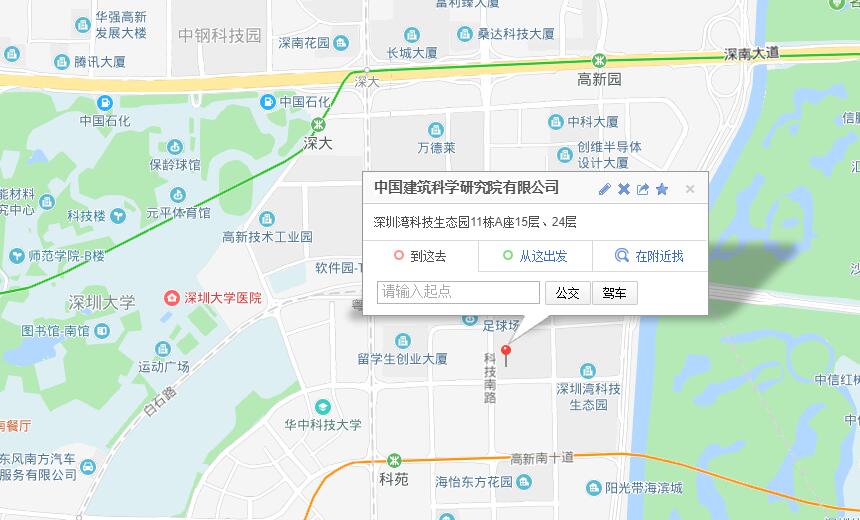 中国建筑科学研究院有限公司深圳分公司电话(TEL):0755-26727000(总机)传真(FAX):0755-26727878 邮编:518057地址:深圳市南山区深圳湾科技生态园11栋A座15层、24层E-mail:yuanban@cabr-sz.com